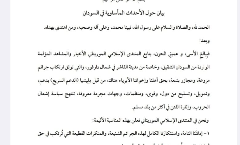 المنتدى الإسلامي الموريتاني يعلن تضامنه مع الشعب السوداني ويدعو الأمة لنصرته