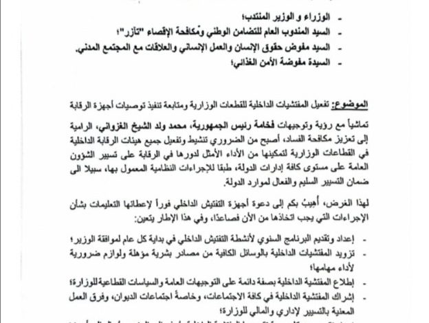 كما ألزم ولد اجاي الوزراء بإطلاع المفتشيات الداخلية بصفة دائمة على التوجيهات العامة والسياسات القطاعية، وإشراكها في كافة الاجتماعات، لا سيما اجتماعات الديوان وفرق العمل المعنية بالتسيير الإداري والمالي.