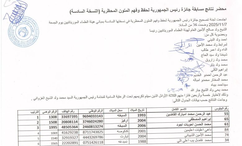 وأوضح المحضر أن لجنة الجائزة اجتمعت بتاريخ السابع من نوفمبر الجاري بمقر هيئة العلماء الموريتانيين لاختيار الفائزين. وكانت المسابقة قد انطلقت في الثامن والعشرين من أكتوبر الماضي في مباني المعهد العالي للدراسات والبحوث الإسلامية.