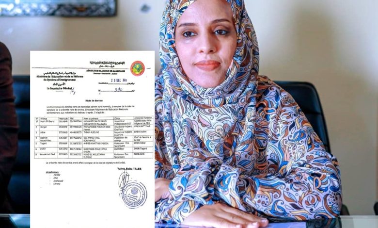 كما قضت المذكرة بتعيين اتيام عاليون مديراً جهوياً في ولاية آدرار، وسيدي أحمد فال بو حمادي مديراً للتربية في ولاية داخلت نواذيبو، بينما تولى أحمد خطار امبده إدارة التربية في ولاية تكانت.