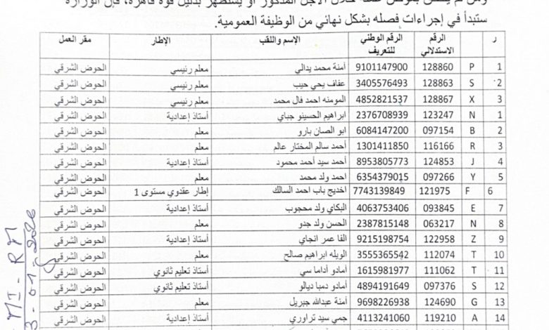 وزارة التربية وإصلاح النظام التعليمي تمنح 217 موظفاً مهلة 72 ساعة للالتحاق بمقرات عملهم قبل الفصل النهائي