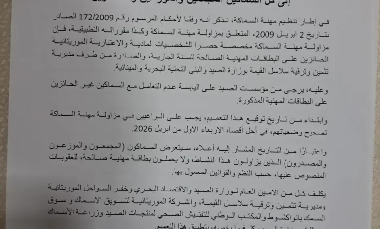 ونبهت الوزارة إلى أن مهنة السماكة مخصصة حصراً للموريتانيين، سواء كانوا أفراداً أو شركات، شريطة حيازتهم للبطاقات الصادرة عن مديرية تثمين وترقية سلاسل القيمة للعام الجاري. كما طالبت الوزارة كافة مؤسسات الصيد البرية بوقف التعامل فوراً مع أي سماك لا يحمل هذه البطاقة.