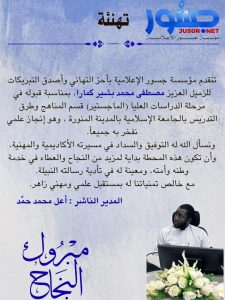 تتقدم مؤسسة جسور الإعلامية بأحرّ التهاني وأصدق التبريكات للزميل العزيز مصطفى محمد بشير كمارا، بمناسبة قبوله في مرحلة الدراسات العليا (الماجستير) قسم المناهج وطرق التدريس بالجامعة الإسلامية بالمدينة المنورة ، وهو إنجاز علمي نفخر به جميعاً.ونسأل الله له التوفيق والسداد في مسيرته الأكاديمية والمهنية، وأن تكون هذه المحطة بداية لمزيد من النجاح والعطاء في خدمة وطنه وأمته، ومعينة له في تأدية رسالته النبيلة.