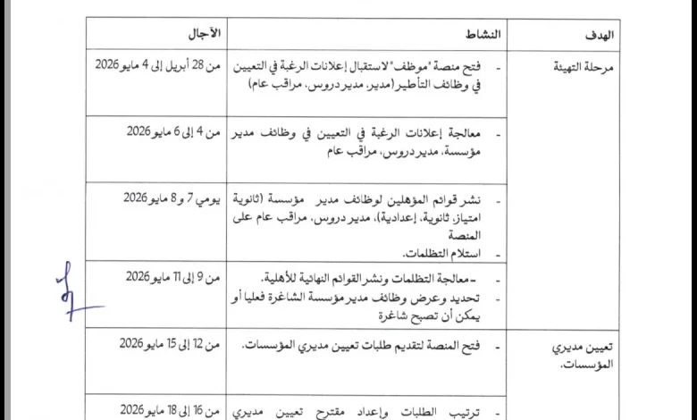 وفي ما يتعلق بتعيين مديري المؤسسات، ستُفتح المنصة مجددا من 12 إلى 15 مايو لتقديم الطلبات، قبل ترتيب الملفات وإعداد مقترحات التعيين بين 16 و18 مايو، على أن تُعلن نتائج اللجنة الفنية في 21 مايو، وتصدر مذكرة التعيين يوم 22 مايو 2026.